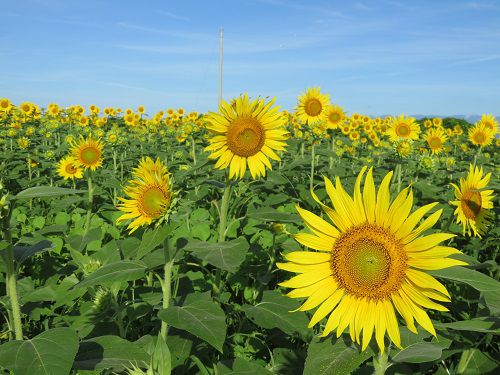 背丈(せたけ)の低いたくさんの向日葵(ひまわり)が畑一面に咲いている。その光景は、ひまわり畑全体を見渡すことができて見通し良く、気持ちの良い風景でした。